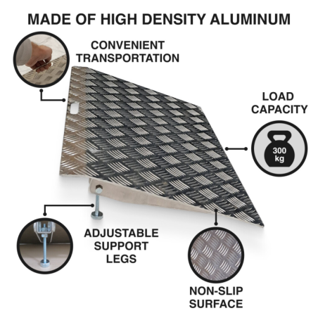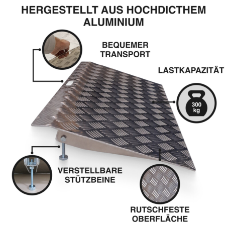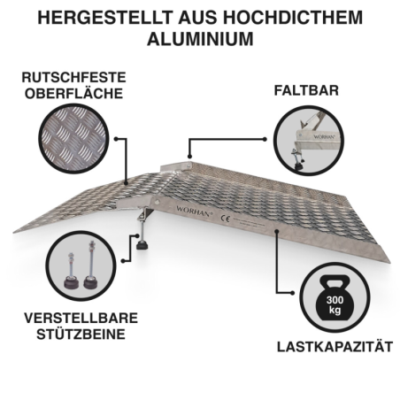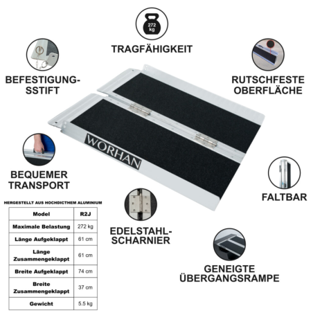 Dieses Erzeugnis ist eine Erfindung und eine einzigartige Lösung für die Benutzer von Rollstühlen, Motorrollern, es kann auch in verschiedenen anderen Fällen verwendet werden. Man kann diese Plattform zweimal zusammenfalten, wegen ihrem eigenartigen Design leicht und bequem tragen, befördern und lagern, obwohl sie vom ersten Blick nicht klein und leicht erscheint. Die Plattform hat einen Griff, nach dem Zusammenfalten wird sie halb so lang und halb so breit. Sie wird aus hochwertigem Aluminium nach den Normen EN-131 und CE gefertigt, wobei die Leichtigkeit, Festigkeit, lange Lebensdauer gewährleistet und zusätzlicher Charme diesem Produkt verliehen werden. Die maximale Belastung unserer Plattformen beträgt 272kg. Die Oberfläche der Plattformen ist mit Rillen versehen, dadurch wird gute Haftung mit den Reifen auch bei Feuchtigkeit bzw. Regen gewährleistet. Das Produkt ist gegen Klimaeinwirkungen, somit auch gegen Alterung beständig. Es wird Ihren Haushalt und Ihr Alltagsleben erleichtern, zusätzliche gute Emotionen verleihen und alle vorherigen Schwierigkeiten bei ihrem Transport und Lagerung beseitigen. Alle unsere Produkte sind neu, zertifiziert und ab Werk verpackt.