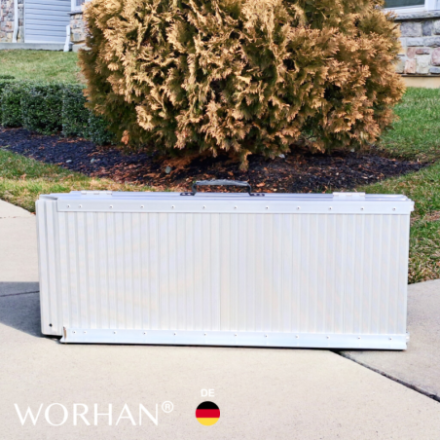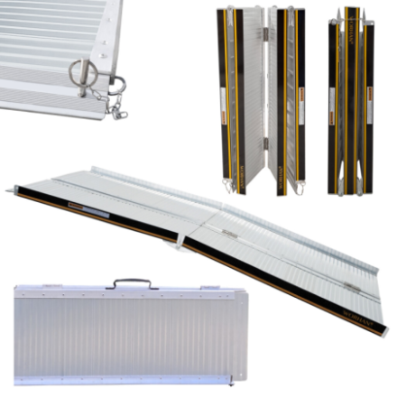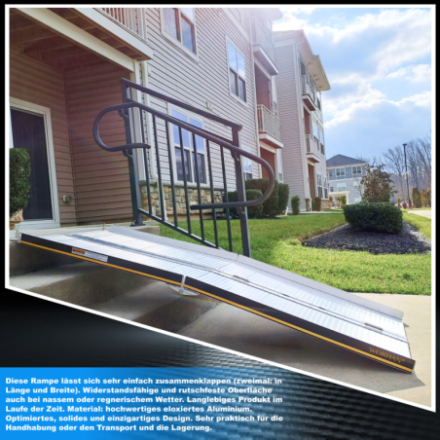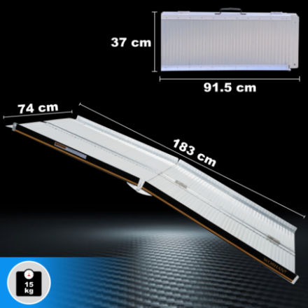 Diese Rampe lässt sich sehr einfach zusammenklappen (zweimal: in Länge und Breite)., Widerstandsfähige und rutschfeste Oberfläche auch bei nassem oder regnerischem Wetter., Langlebiges Produkt im Laufe der Zeit., Material: hochwertiges eloxiertes Aluminium., Optimiertes, solides und einzigartiges Design., Sehr praktisch für die Handhabung oder den Transport und die Lagerung.