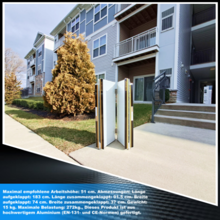 Maximal empfohlene Arbeitshöhe: 51cm., Abmessungen: Länge aufgeklappt: 183cm., Länge zusammengeklappt: 91.5cm., Breite aufgeklappt: 74cm., Breite zusammengeklappt: 37cm., Gewicht: 15kg., Maximale Belastung: 300kg., Dieses Produkt ist aus hochwertigem Aluminium (EN-131- und CE-Normen) gefertigt.