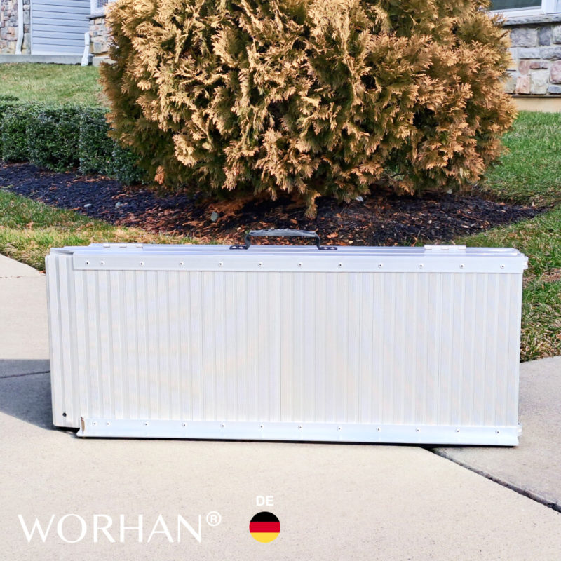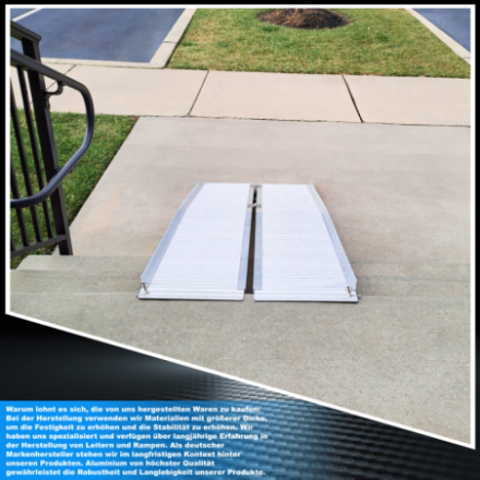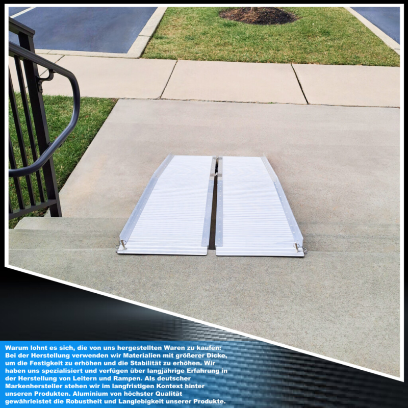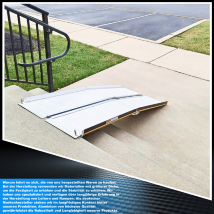 Warum lohnt es sich, die von uns hergestellten Waren zu kaufen: Bei der Herstellung verwenden wir Materialien mit größerer Dicke, um die Festigkeit zu erhöhen und die Stabilität zu erhöhen., Wir haben uns spezialisiert und verfügen über langjährige Erfahrung in der Herstellung von Leitern und Rampen., Als deutscher Markenhersteller stehen wir im langfristigen Kontext hinter unseren Produkten. Aluminium von höchster Qualität gewährleistet die Robustheit und Langlebigkeit unserer Produkte.