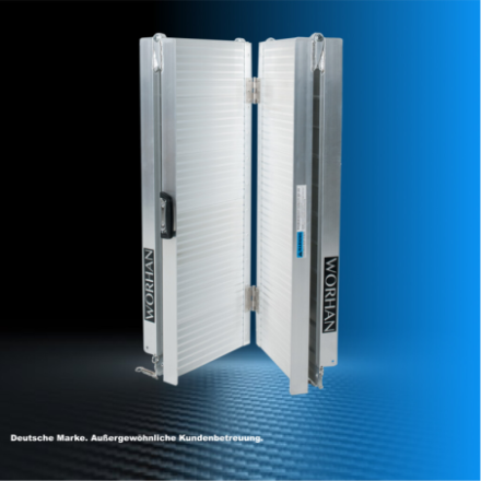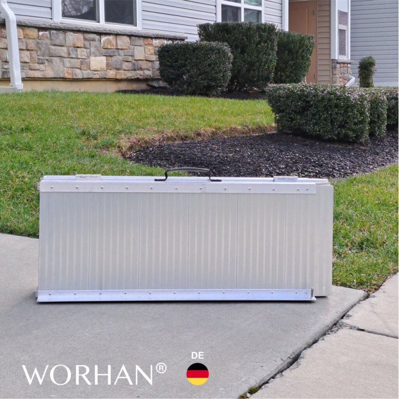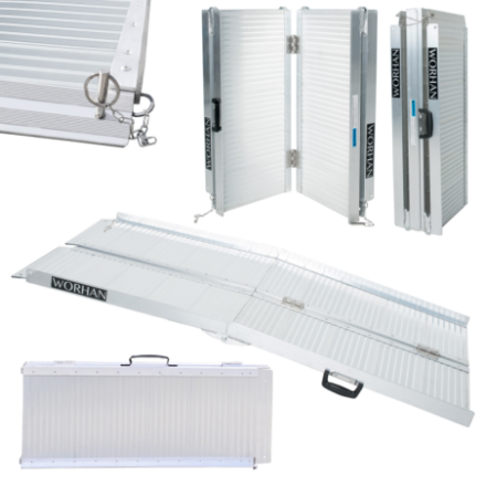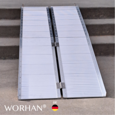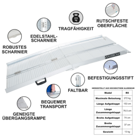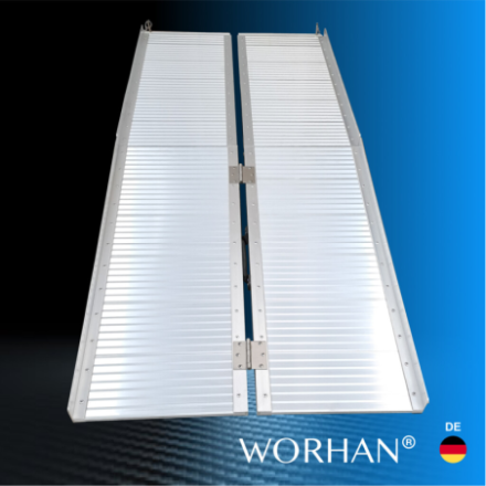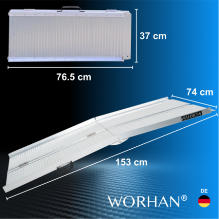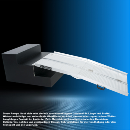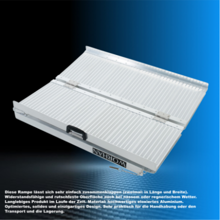 Diese Rampe lässt sich sehr einfach zusammenklappen (zweimal: in Länge und Breite)., Widerstandsfähige und rutschfeste Oberfläche auch bei nassem oder regnerischem Wetter., Langlebiges Produkt im Laufe der Zeit., Material: hochwertiges eloxiertes Aluminium., Optimiertes, solides und einzigartiges Design., Sehr praktisch für die Handhabung oder den Transport und die Lagerung.