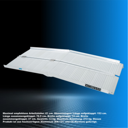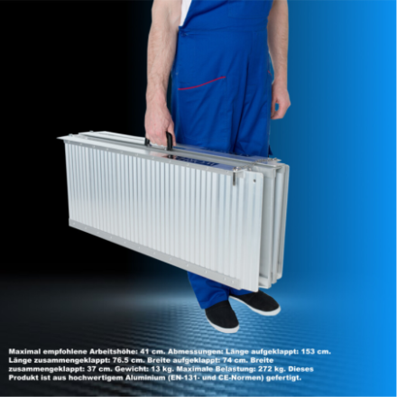 Maximal empfohlene Arbeitshöhe: 41cm., Abmessungen: Länge aufgeklappt: 153cm., Länge zusammengeklappt: 76.5cm., Breite aufgeklappt: 74cm., Breite zusammengeklappt: 37cm., Gewicht: 13kg., Maximale Belastung: 300kg., Dieses Produkt ist aus hochwertigem Aluminium (EN-131- und CE-Normen) gefertigt.