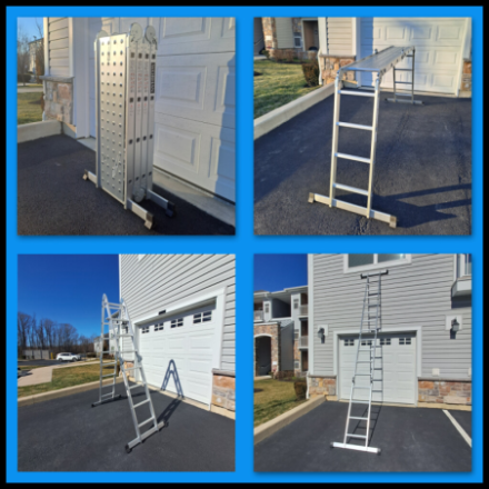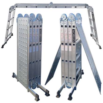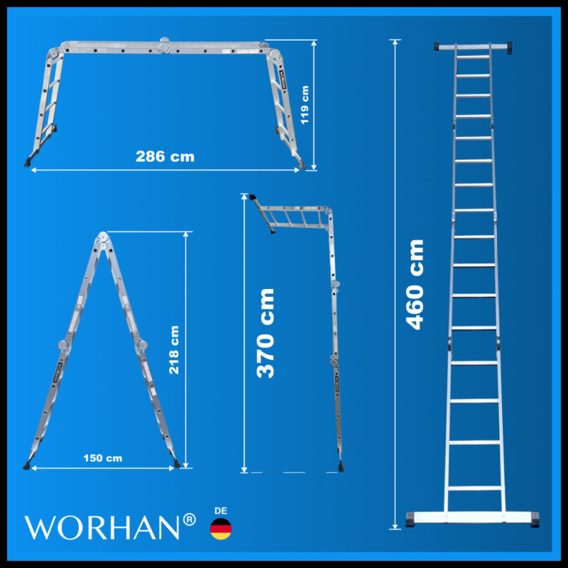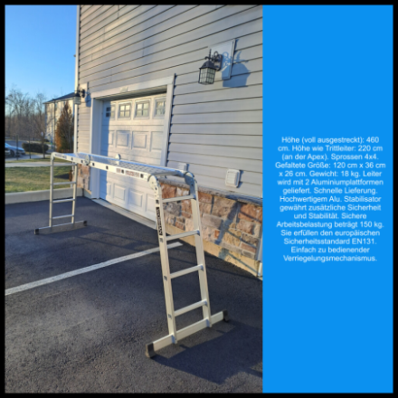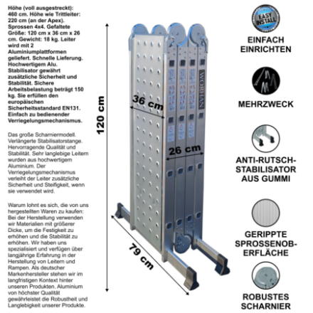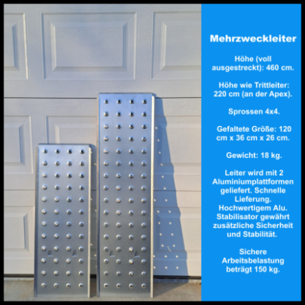 Höhe (voll ausgestreckt): 460cm., Höhe wie Trittleiter: 220cm (an der Apex)., Sprossen 4x4., Gefaltete Größe: 120cm x 36cm x 26cm., Gewicht: 18kg., Leiter wird mit 2 Aluminiumplattformen geliefert.