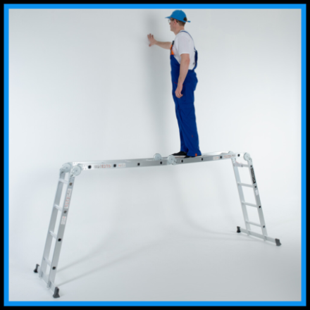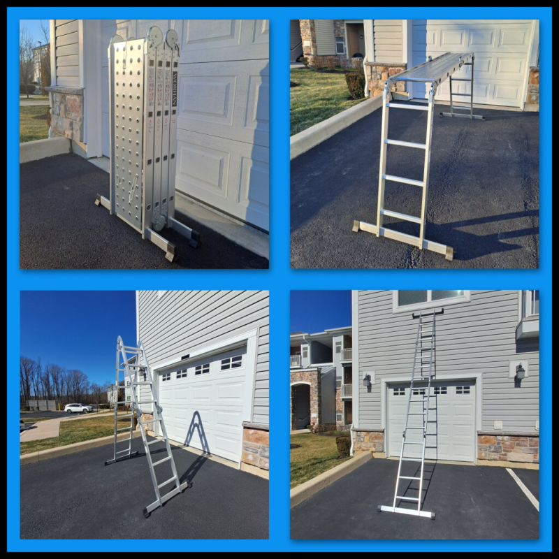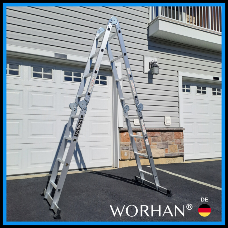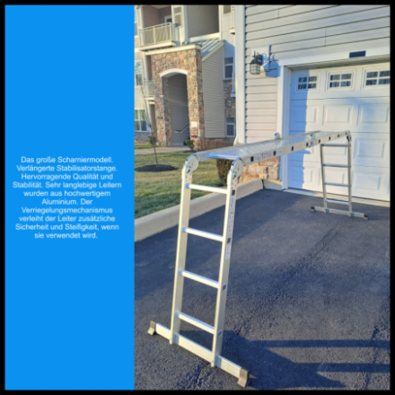 Das große Scharniermodell., Verlängerte Stabilisatorstange., Hervorragende Qualität und Stabilität., Sehr langlebige Leitern wurden aus hochwertigem Aluminium., Der Verriegelungsmechanismus verleiht der Leiter zusätzliche Sicherheit und Steifigkeit, wenn sie verwendet wird.