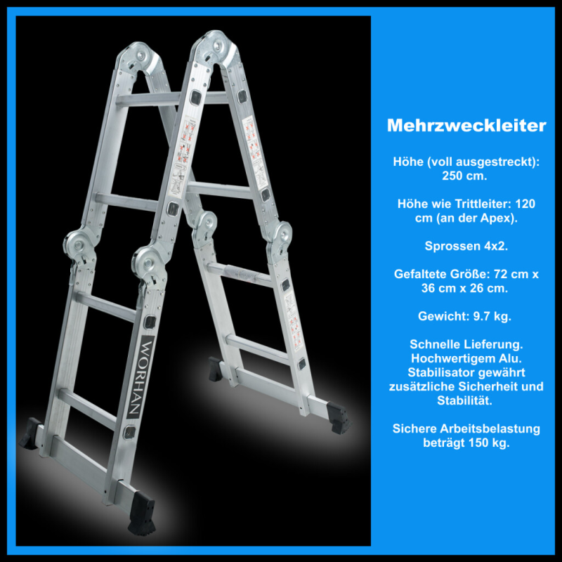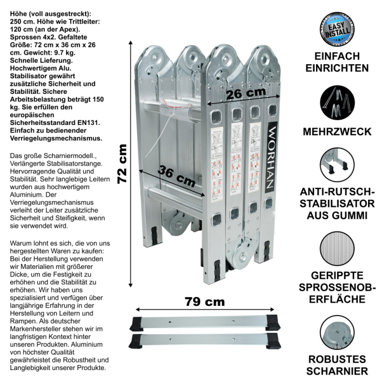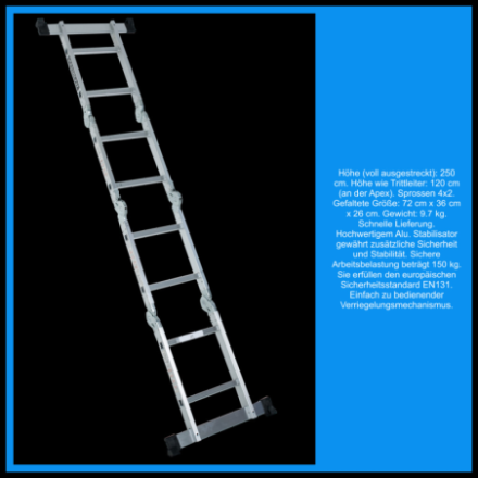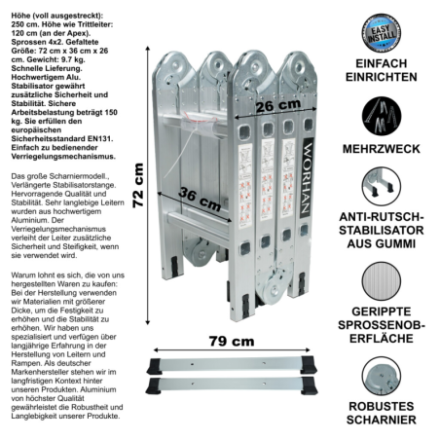 Schnelle Lieferung. Hochwertigem Alu., Stabilisator gewährt zusätzliche Sicherheit und Stabilität., Sichere Arbeitsbelastung beträgt 150 kg., Sie erfüllen den europäischen Sicherheitsstandard EN131., Einfach zu bedienender Verriegelungsmechanismus.