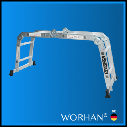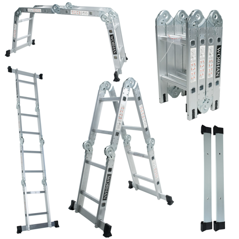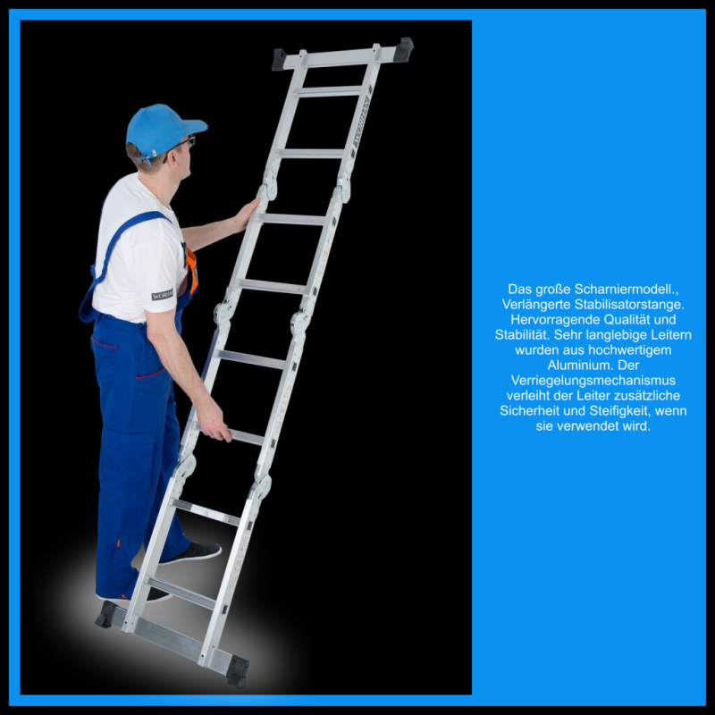 Das große Scharniermodell., Verlängerte Stabilisatorstange., Hervorragende Qualität und Stabilität., Sehr langlebige Leitern wurden aus hochwertigem Aluminium., Der Verriegelungsmechanismus verleiht der Leiter zusätzliche Sicherheit und Steifigkeit, wenn sie verwendet wird.
