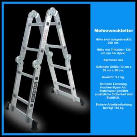 Höhe (voll ausgestreckt): 250cm., Höhe wie Trittleiter: 120cm (an der Apex)., Sprossen 4x2., Gefaltete Größe: 72cm x 36cm x 26cm., Gewicht: 9.7kg