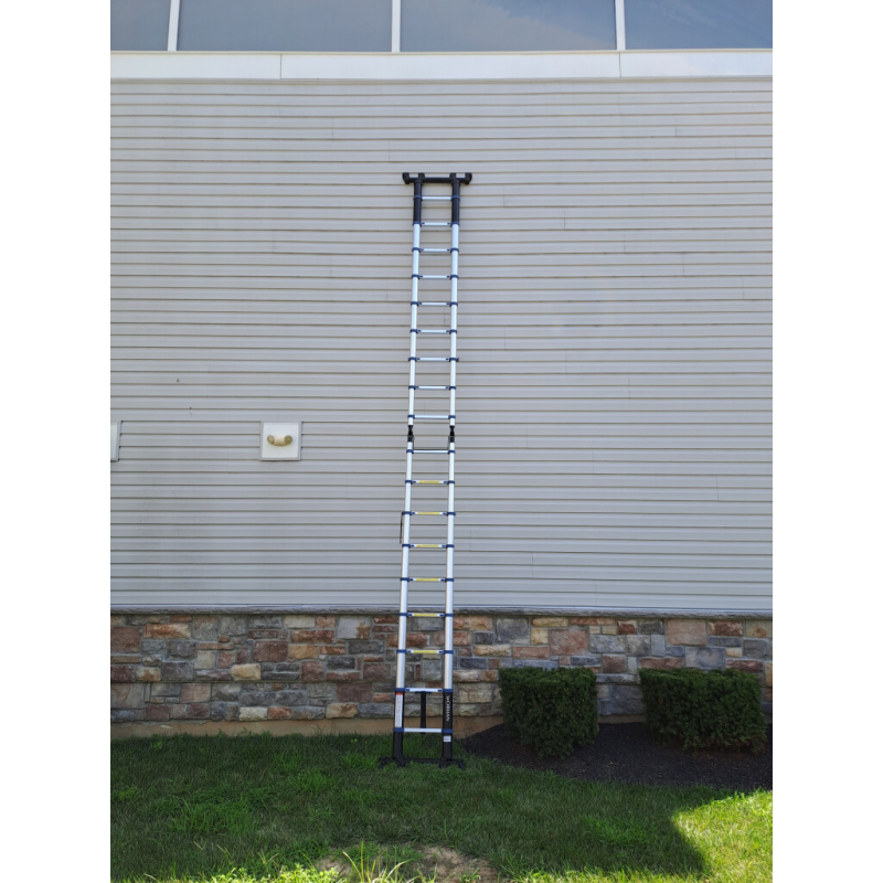 Höhe (voll ausgestreckt): 560cm., Höhe wie Trittleiter: 270cm (an der Apex)., Sprossen 2x9., Gefaltete Größe: 97cm x 49cm x 20cm., Gewicht: 19.7kg. Ausgestattet mit DOPPELT-TELESKOP-Stabilisatoren