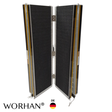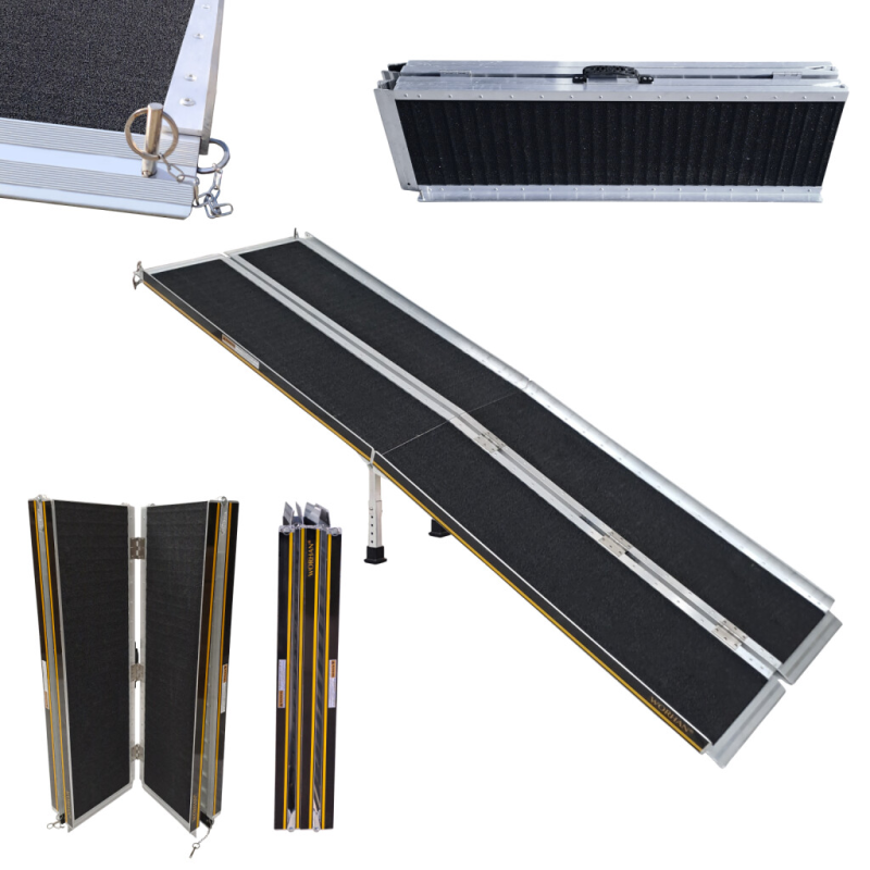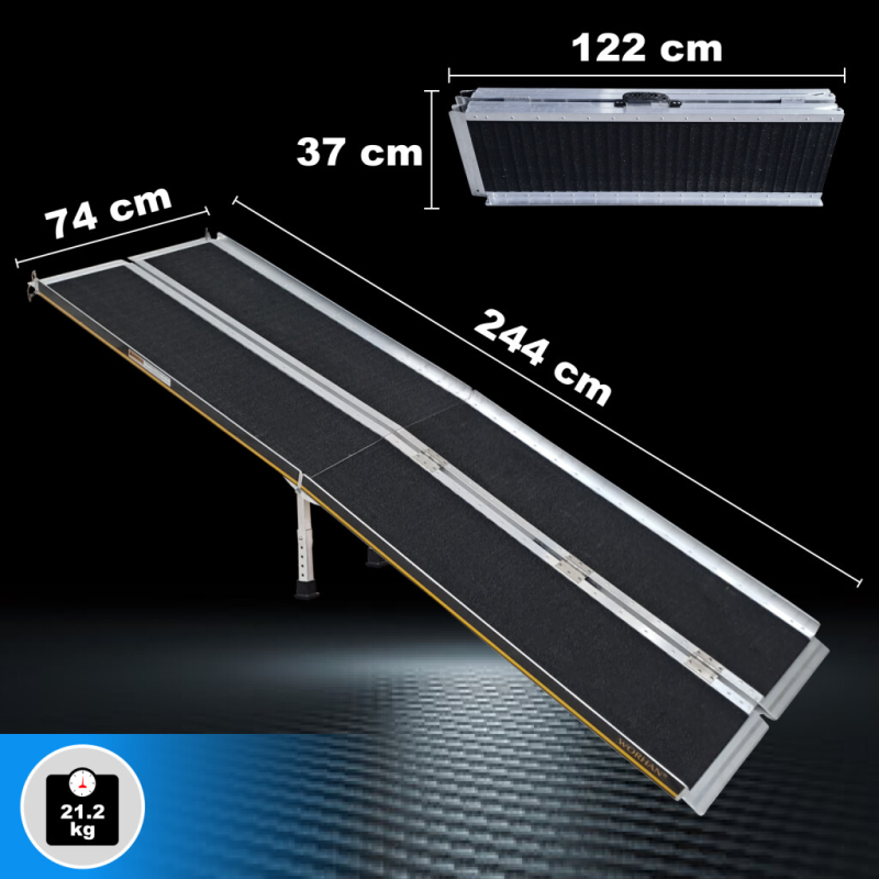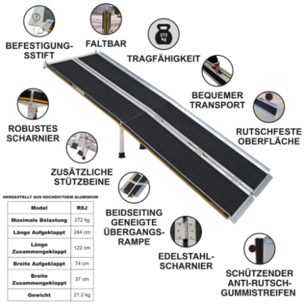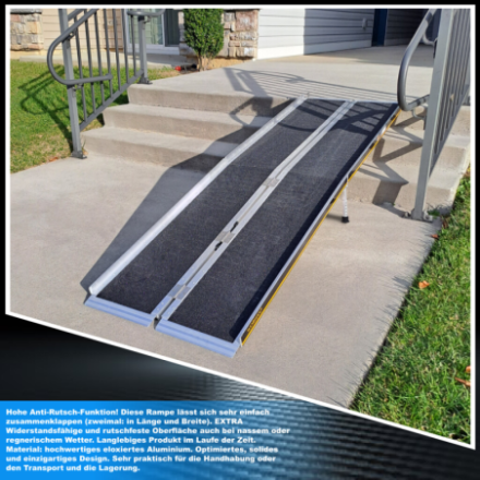 Hohe Anti-Rutsch-Funktion! Diese Rampe lässt sich sehr einfach zusammenklappen (zweimal: in Länge und Breite)., EXTRA Widerstandsfähige und rutschfeste Oberfläche auch bei nassem oder regnerischem Wetter., Langlebiges Produkt im Laufe der Zeit., Material: hochwertiges eloxiertes Aluminium., Optimiertes, solides und einzigartiges Design., Sehr praktisch für die Handhabung oder den Transport und die Lagerung.
