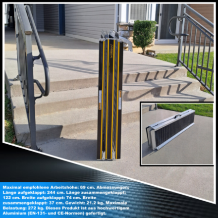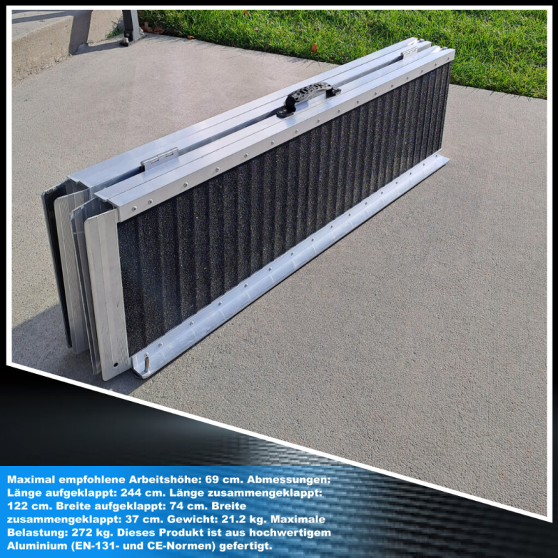 Maximal empfohlene Arbeitshöhe: 69cm., Abmessungen: Länge aufgeklappt: 244cm., Länge zusammengeklappt: 122cm., Breite aufgeklappt: 74cm., Breite zusammengeklappt: 37cm., Gewicht: 21.4kg., Maximale Belastung: 300kg., Dieses Produkt ist aus hochwertigem Aluminium (EN-131- und CE-Normen) gefertigt.