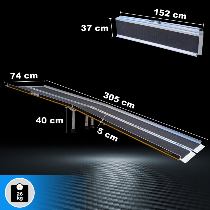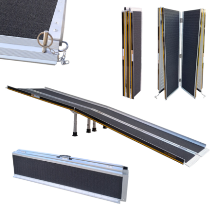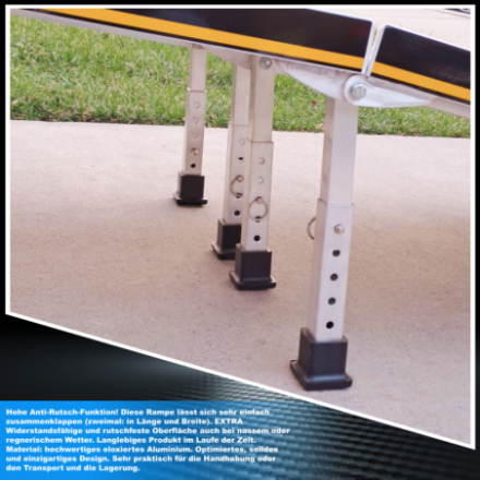 Hohe Anti-Rutsch-Funktion! Diese Rampe lässt sich sehr einfach zusammenklappen (zweimal: in Länge und Breite)., EXTRA Widerstandsfähige und rutschfeste Oberfläche auch bei nassem oder regnerischem Wetter., Langlebiges Produkt im Laufe der Zeit., Material: hochwertiges eloxiertes Aluminium., Optimiertes, solides und einzigartiges Design., Sehr praktisch für die Handhabung oder den Transport und die Lagerung.