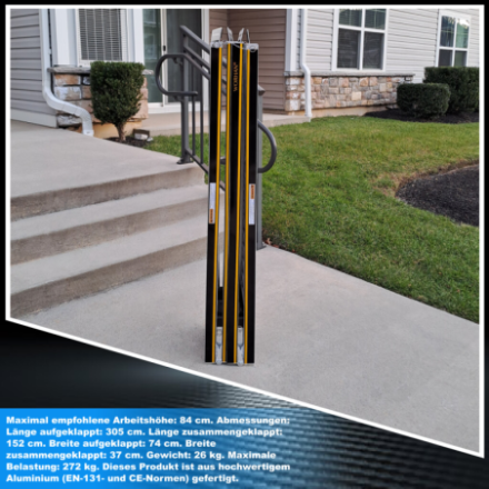 Maximal empfohlene Arbeitshöhe: 84cm., Abmessungen: Länge aufgeklappt: 305cm., Länge zusammengeklappt: 152cm., Breite aufgeklappt: 74cm., Breite zusammengeklappt: 37cm., Gewicht: 26.2kg., Maximale Belastung: 300kg., Dieses Produkt ist aus hochwertigem Aluminium (EN-131- und CE-Normen) gefertigt.