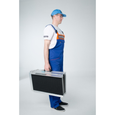 Maximal empfohlene Arbeitshöhe: 35.5cm., Abmessungen: Länge aufgeklappt: 122cm., Länge zusammengeklappt: 61cm., Breite aufgeklappt: 74cm., Breite zusammengeklappt: 37cm., Gewicht: 11.6kg., Maximale Belastung: 300kg., Dieses Produkt ist aus hochwertigem Aluminium (EN-131- und CE-Normen) gefertigt.