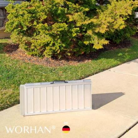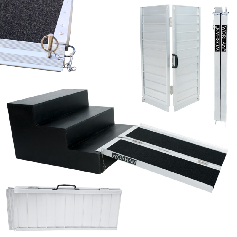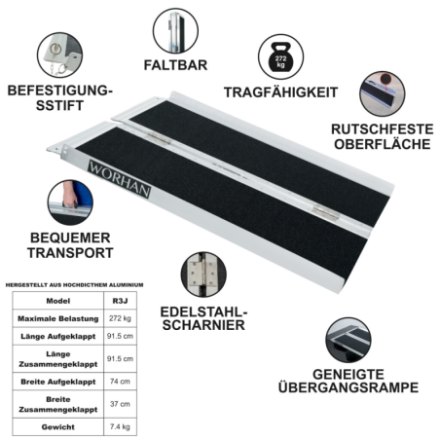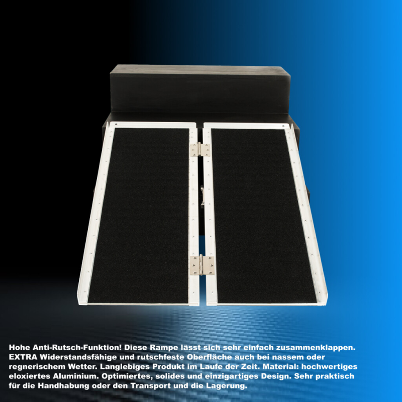 Hohe Anti-Rutsch-Funktion! Diese Rampe lässt sich sehr einfach zusammenklappen., EXTRA Widerstandsfähige und rutschfeste Oberfläche auch bei nassem oder regnerischem Wetter., Langlebiges Produkt im Laufe der Zeit., Material: hochwertiges eloxiertes Aluminium., Optimiertes, solides und einzigartiges Design., Sehr praktisch für die Handhabung oder den Transport und die Lagerung.