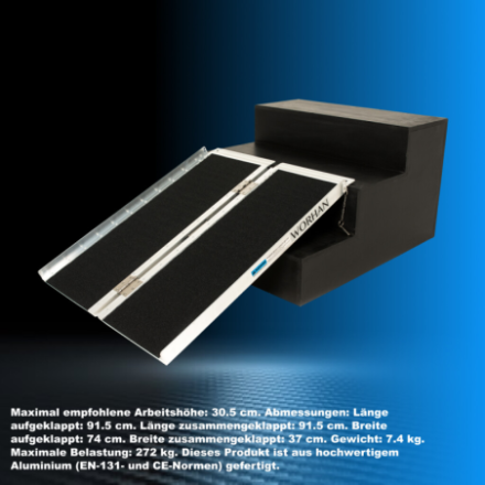 Maximal empfohlene Arbeitshöhe: 30.5cm., Abmessungen: Länge aufgeklappt: 91.5cm., Länge zusammengeklappt: 91.5cm., Breite aufgeklappt: 74cm., Breite zusammengeklappt: 37cm., Gewicht: 7.5kg., Maximale Belastung: 300kg., Dieses Produkt ist aus hochwertigem Aluminium (EN-131- und CE-Normen) gefertigt.