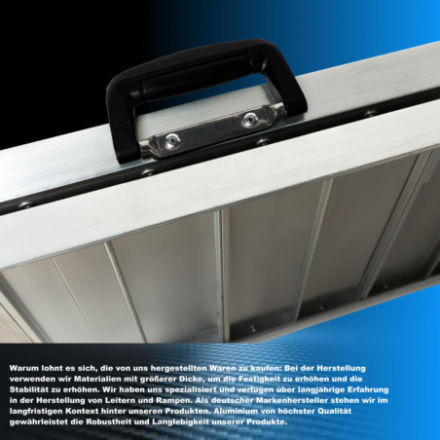 Warum lohnt es sich, die von uns hergestellten Waren zu kaufen: Bei der Herstellung verwenden wir Materialien mit größerer Dicke, um die Festigkeit zu erhöhen und die Stabilität zu erhöhen., Wir haben uns spezialisiert und verfügen über langjährige Erfahrung in der Herstellung von Leitern und Rampen., Als deutscher Markenhersteller stehen wir im langfristigen Kontext hinter unseren Produkten. Aluminium von höchster Qualität gewährleistet die Robustheit und Langlebigkeit unserer Produkte.