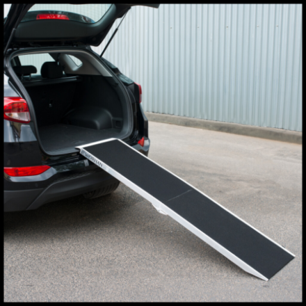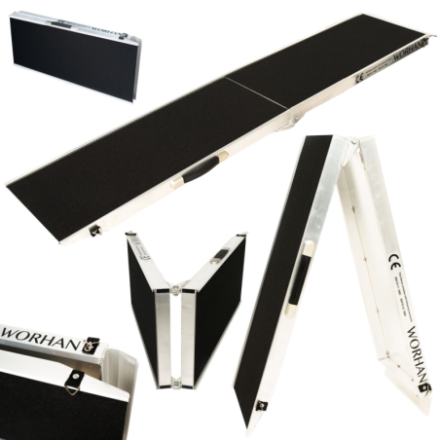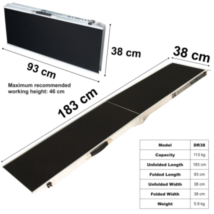 Abmessungen nach dem Zusammenklappen – 93 x 12 x 38 cm.Die Tragfähigkeit der Rampe beträgt bis 113 kg. 2 Jahre Garantie.