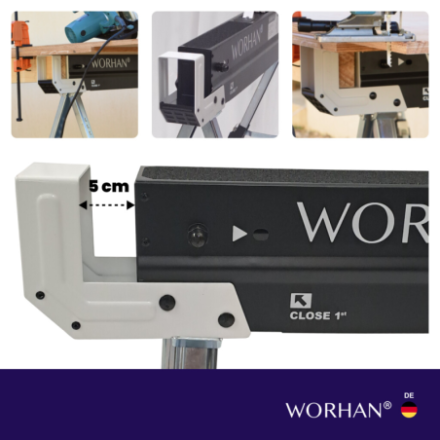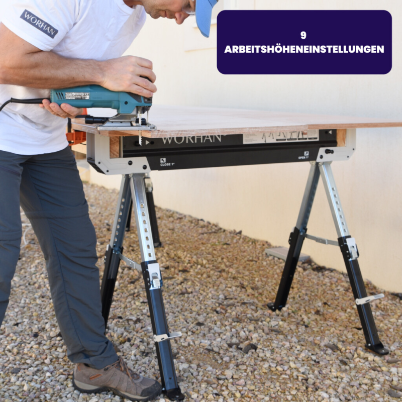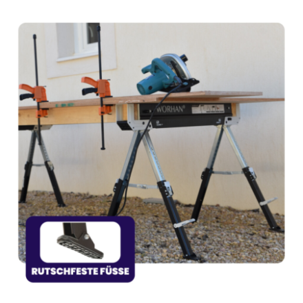 Durch Einsatz einer Arbeitsbohle (nicht ausziehbar) und 2 Böcken kann eine feste Arbeitsplattform aufgestellt werden. Rutschfeste Auflagefläche und Füße sorgen für sicheres Arbeiten. Einfache Einrichtung. 2 Stützleisten zur günstigeren Einrichtung.