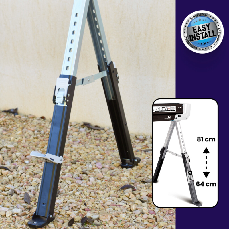 Abmessungen: 109cm x 10cm x 15cm. Gewicht 9.3kg (18.6 kg Paar). Tragkraft 590kg (1180kg pro Paar). 9 Arbeitshöheneinstellungen (64cm bis 81cm) und schnell verstellbare Füße.