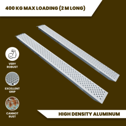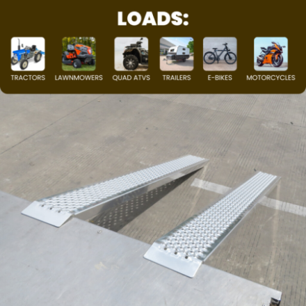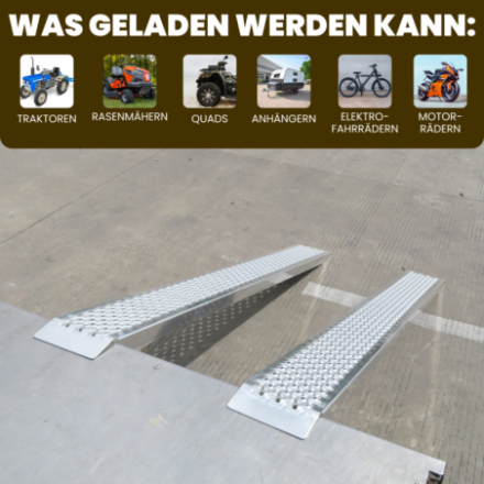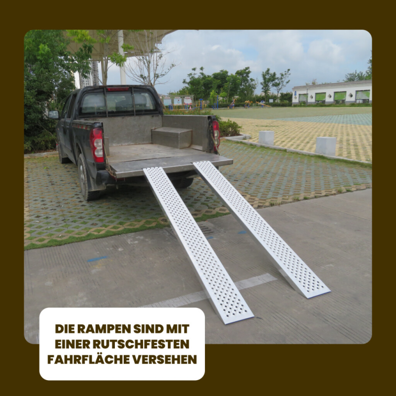 Die Rampen können zum Beladen von Traktoren oder Rasenmähern, Quad ATVs, Anhängern, Elektrofahrrädern, Motorrädern usw. verwendet werden. Abgeschrägte Seitenkanten für erhöhten Kontakt am oberen Lagerpunkt.