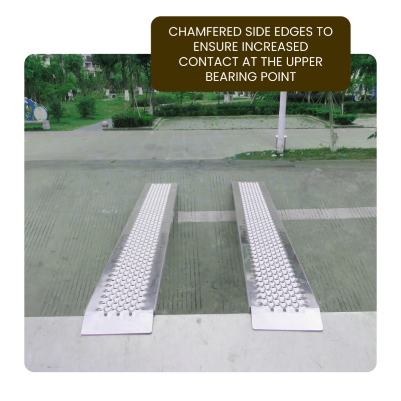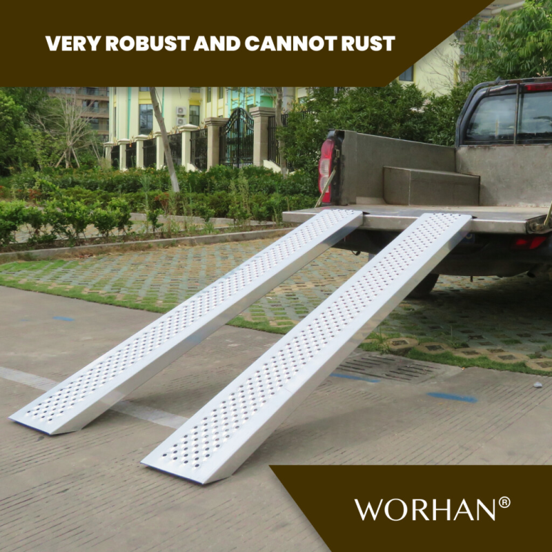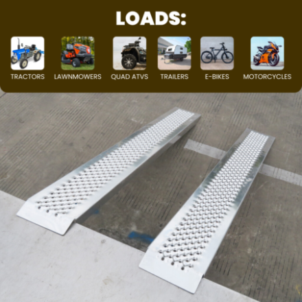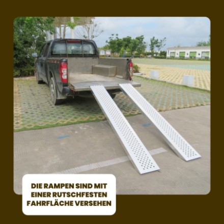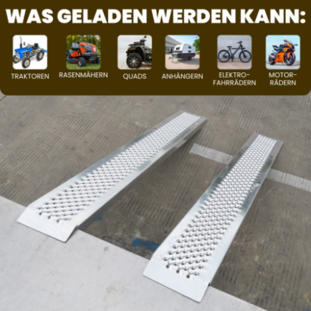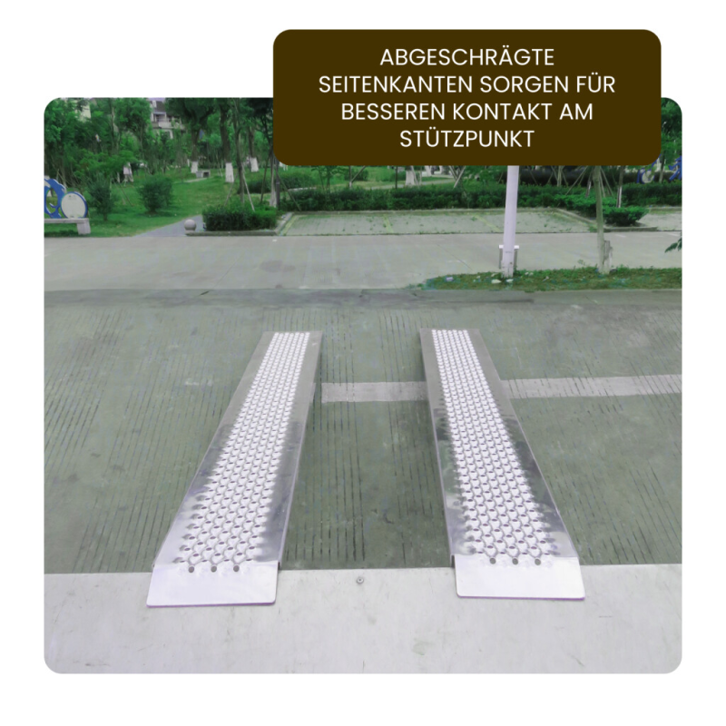 Die Rampen können zum Beladen von Traktoren oder Rasenmähern, Quad ATVs, Anhängern, Elektrofahrrädern, Motorrädern usw. verwendet werden. Abgeschrägte Seitenkanten, um einen erhöhten Kontakt am oberen Drehpunkt zu gewährleisten.