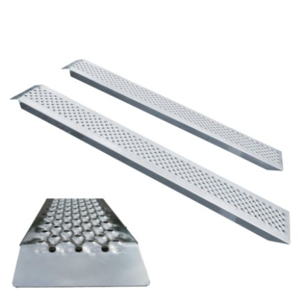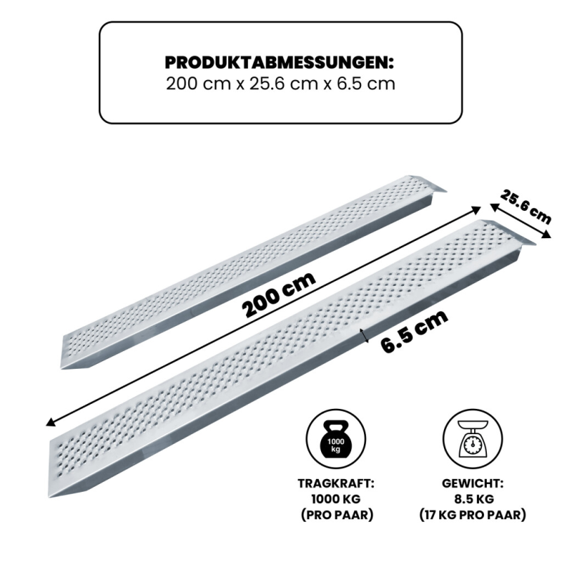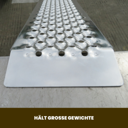 Das Produkt ist aus hochwertigem Aluminium nach EN- und CE-Normen gefertigt. Aus Aluminium gefertigt, sind sie extrem leicht (jeweils 8,5 kg), sehr robust und können nicht rosten. Oberfläche: perforiert - rutschfest, für hervorragende Griffigkeit.