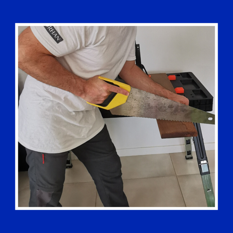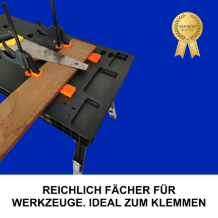 Zahlreiche Aussparungen für Schrauben, Muttern, Dübel und auch für verschiedene Werkzeuge: Schraubendreher, Zange etc. Lineal (auf 2 Seiten) und Winkelmesser sind auf der Arbeitsfläche eingraviert.