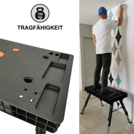 Drei einstellbare Arbeitshöhen: a) 80cm., b) 66cm. und c) 52cm., Belastbarkeit: 150kg, Gewicht: 15kg, Größe aufgeklappt: 129cm x 59cm x 80cm, Größe zusammengeklappt: 94cm x 48cm x 16cm,