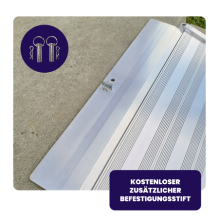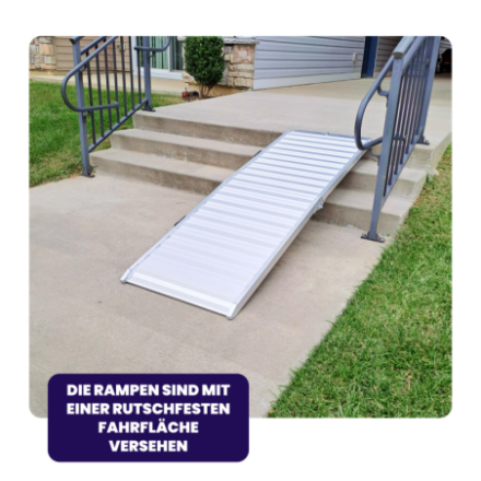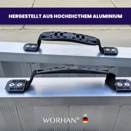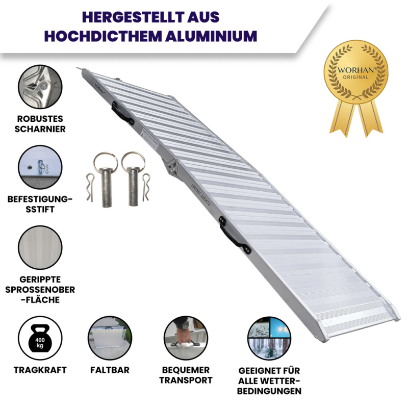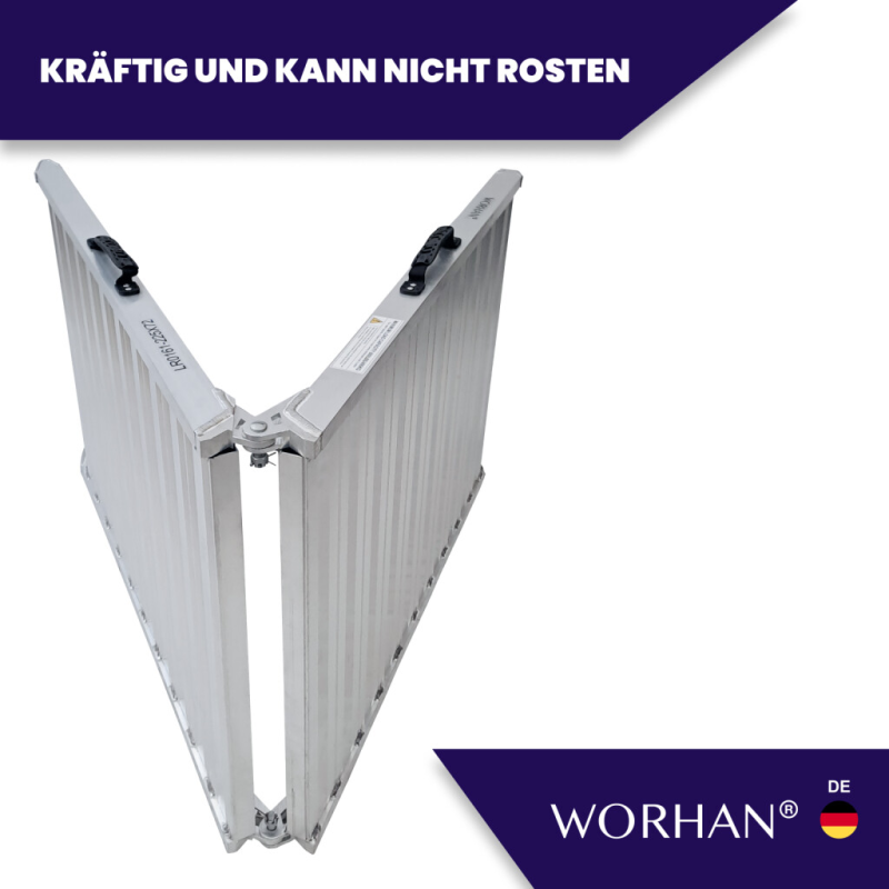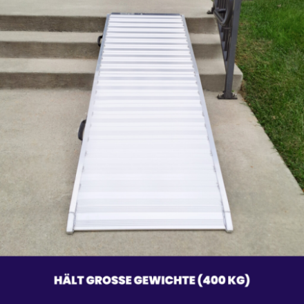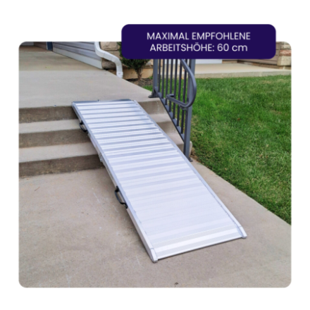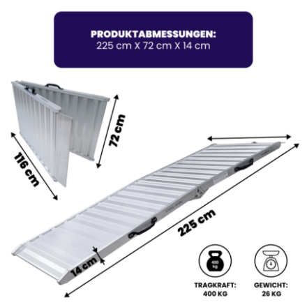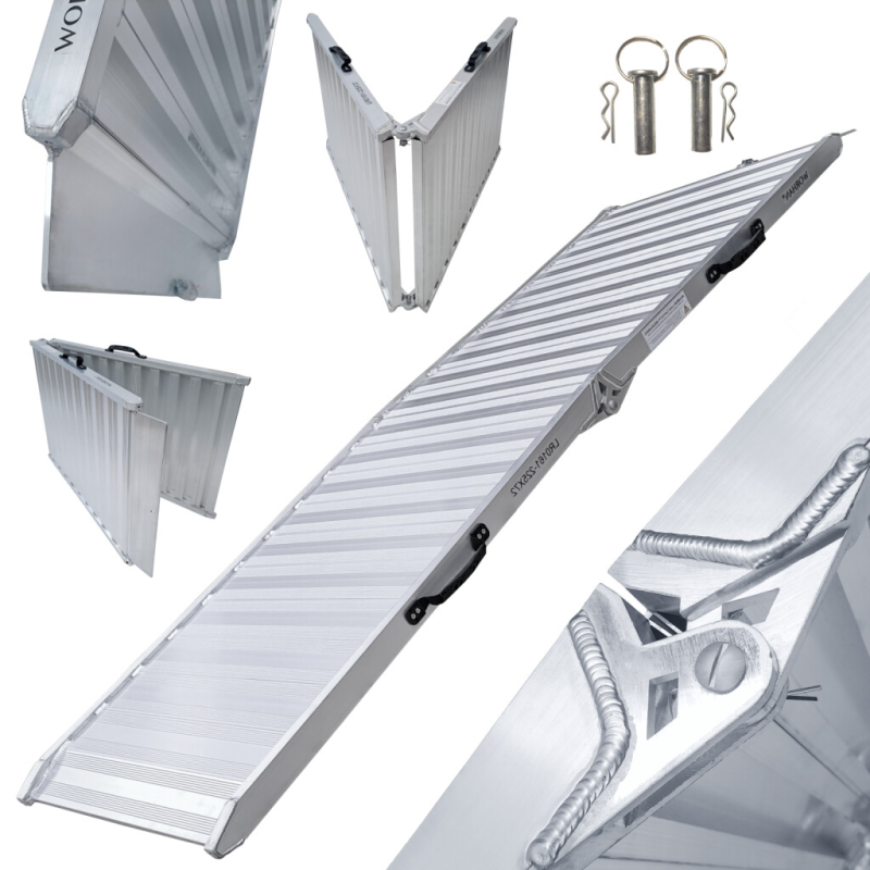 Hochfestes eloxiertes Aluminium sowie die ultra-rutschfeste Oberfläche. Die Rampe ist mit bequemen und widerstandsfähigen Tragegriffen ausgestattet.