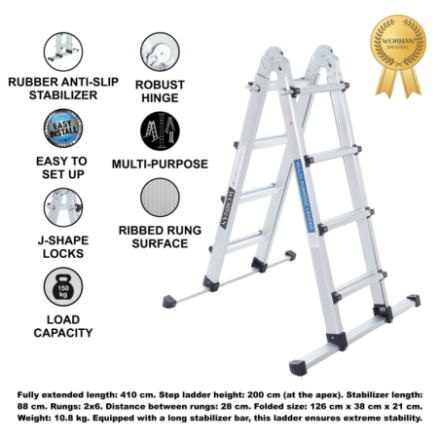Höhe (voll ausgestreckt): 410cm., Höhe wie Trittleiter: 200cm (an der Apex)., Länge der Stabilisatorstange: 88cm., Abstand zwischen den Sprossen: 28 cm., Sprossen 2x6., Gefaltete Größe: 126cm x 38cm x 21cm., Gewicht: 10.8kg., Ausgestattet mit einer langen Stabilisatorstange sorgt sie für extreme Stabilität.
